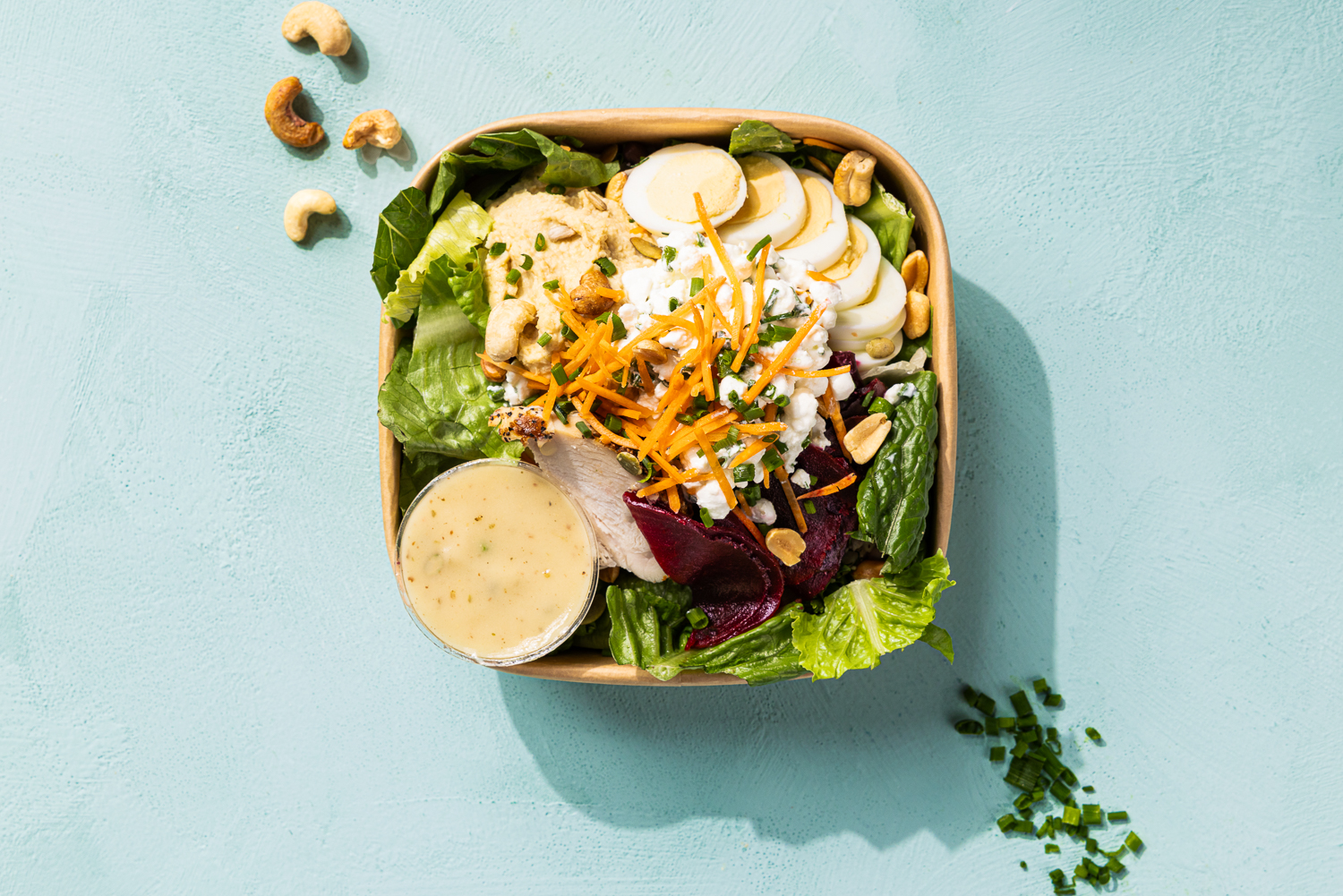 Kylling, egg, ristede nøtter og frø, cottage cheese med gressløk, hummus, rødbeter, gulrot, bønnemiks, blomkålris med grønnkål og urter og hvit balsamicovinaigrette